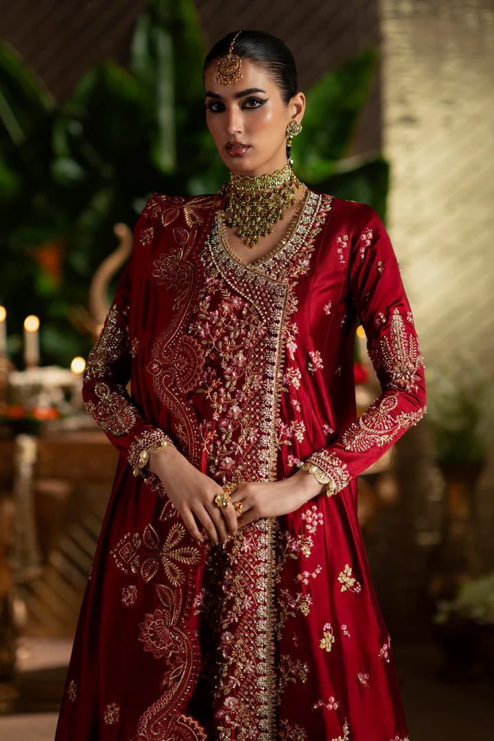 A timeless deep red angrakha adorned with exquisite miniature embroidery in vibrant hues, enriched with delicate handwork that speaks of true craftsmanship. Paired with a beautifully embroidered dupatta and classic sharara pants, this ensemble is a perfect blend of elegance and tradition.