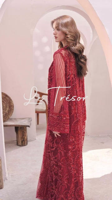 Stunning red net dress, is a true masterpiece of hand embellishment and design. This long, sparkly gown is meticulously adorned with intricate hand-embellished details that catch the light with every movement,...