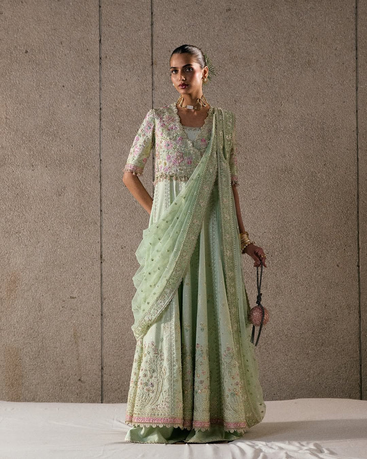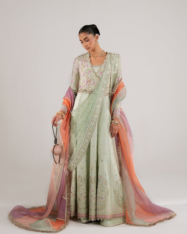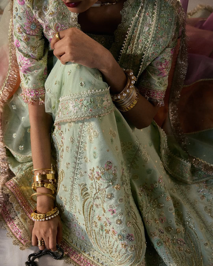 In refreshing icy mint, this six-piece look features a jacquard silk pishwas with a scoop neckline, hot pink contrast borders, and lace-lined panels. Sleeve options include half or full, both embroidered and finished with tassels. A raw silk coatee wraps over the pishwas, fully embroidered with multicolored handwork, scalloped edges, and tassel detailing. Paired with matching loose raw silk pants and a printed slip. The double-drape net dupatta is finished with embroidered borders and a soft mesh spray, offering versatile styling.