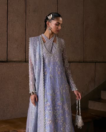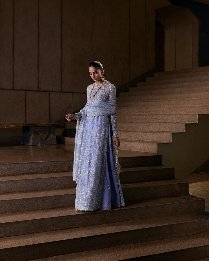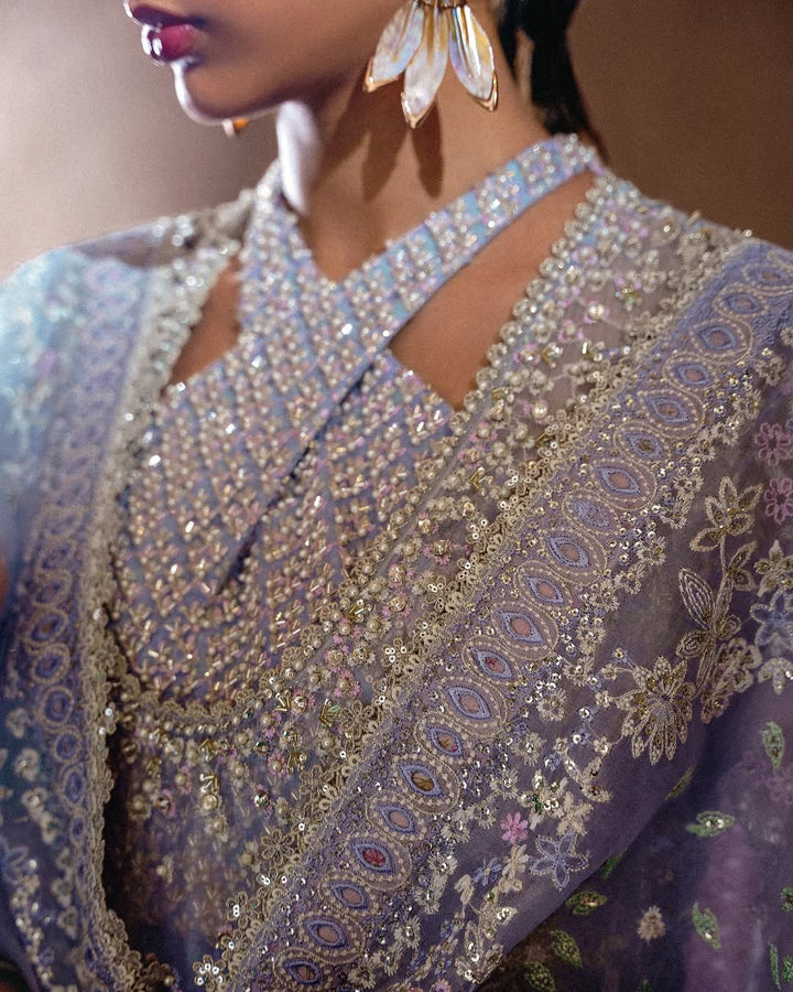 Soft periwinkle, this four-piece ensemble radiates grace. The organza long shirt with a crossover, embellished neckline with mesh detail over a printed pishwas, finished with tasselled borders and fitted sleeves. Paired with raw silk bell-cut pants and a richly embroidered organza dupatta with four-sided borders and lace finishes, the look is refined and radiant.”