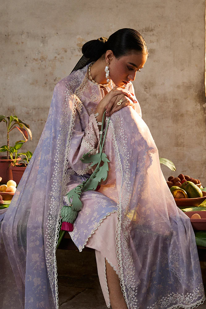 Periwinkle Peach printed lawn kaftan-style A-line shirt with raglan sleeves, 3D floral motifs, applique embroidery, and bell sleeves with chiffli and boring accents. V-neckline with hanging tassels and fringes adds movement.