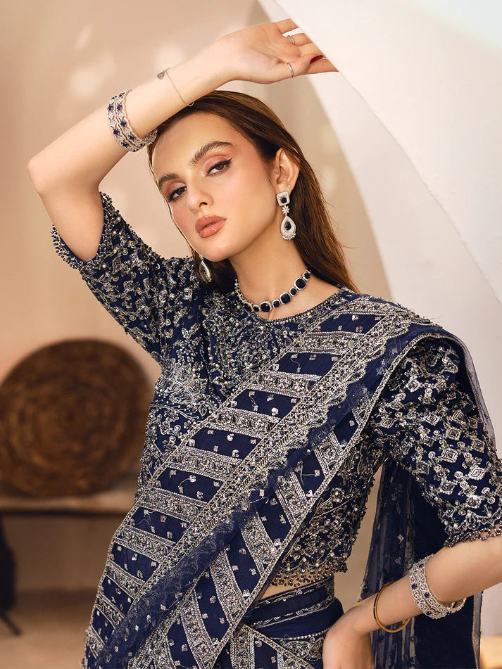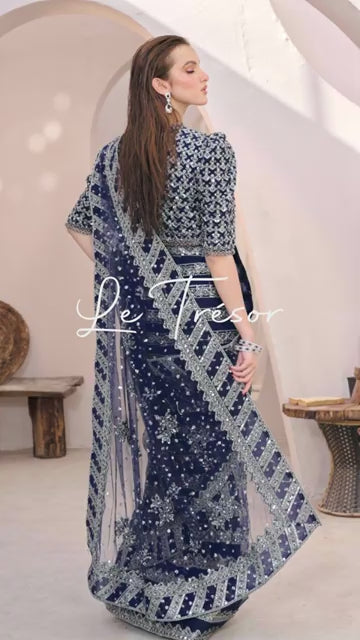 Indulge in the enchanting allure of our navy-blue net saree, a masterpiece of elegance and refinement. This exquisite saree features hand-embellished silver borders that shimmer with every movement, adding a touch of sophistication and grace to the ethereal net fabric.Paired with a matching navy-blue blouse, this ensemble is a true celebration of intricate craftsmanship. The blouse is adorned with delicate silver handcrafting and adorned with shimmering beads, creating a harmonious blend of texture and sparkle. Each element of the blouse is meticulously designed, enhancing the overall opulence of the outfit.