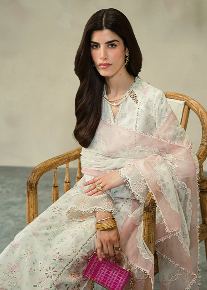 Ivory white printed lawn a-line shirt, V-neckline with keyholes and ragline additions cutwork detail and Printed base with layered scalloped sleeves with peachy pink organza border. Straight pants with cutwork details....