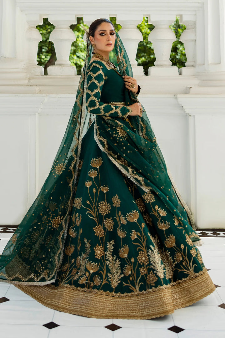 This majestic emerald green lehenga choli boasts modern embroidery and elegance with a beautifully draped organza dupatta and the embellished hem with an intricate gold border, adding a sublime touch of luxury and refinement.