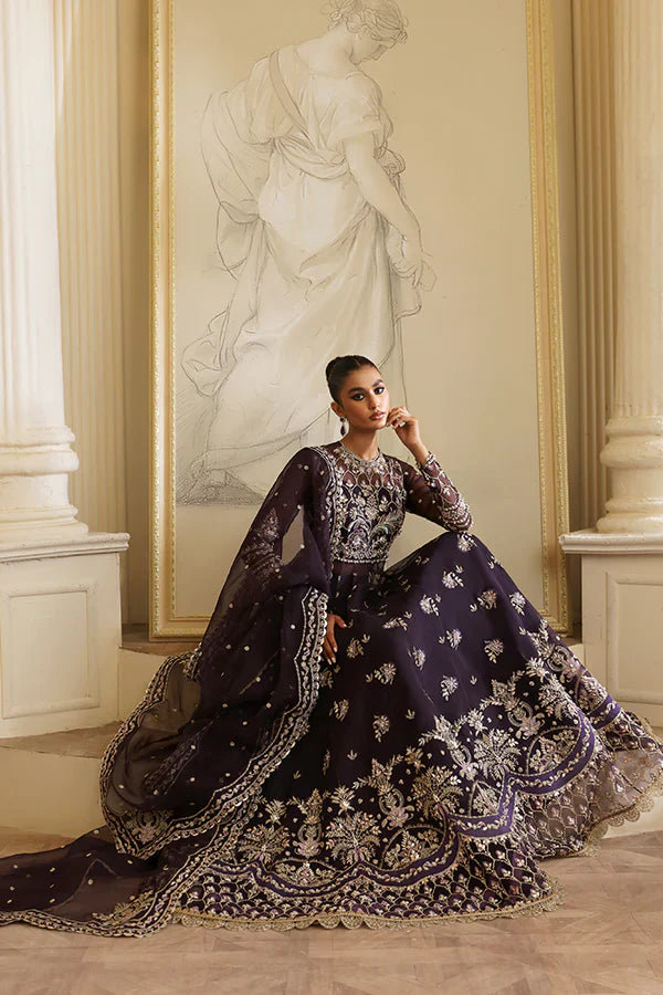 Introducing the Evolet Pishwas, a majestic ensemble in a regal purple hue. This outfit features an organza shirt adorned with intricate floral embroidery and sequin embellishments. Paired with a raw silk...