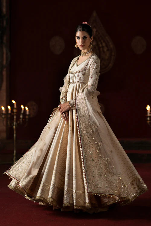 A timeless flairy pishwas in a soft pinkish white hue, adorned with delicate handwork on the bodice that adds regal charm. Paired with an intricately embellished organza dupatta, this ensemble flows with grace and sophistication — perfect for an ethereal bridal or festive statement.