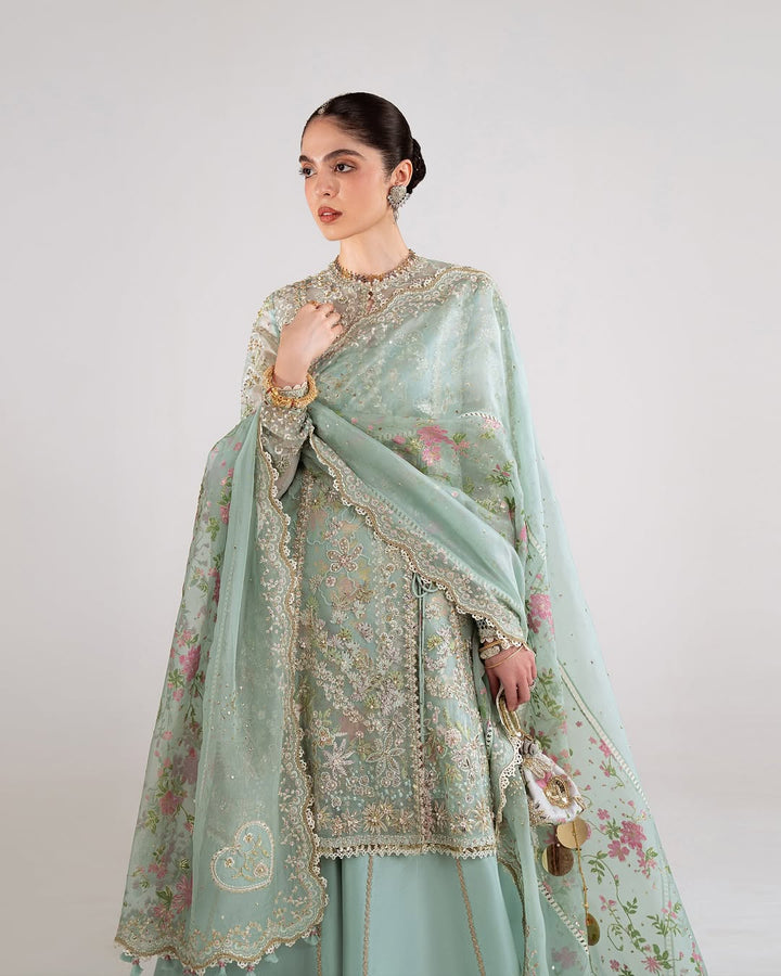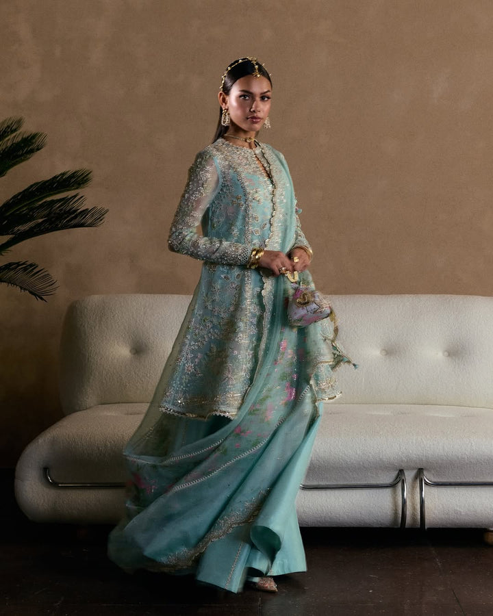 In serene aquamarine, this four-piece look exudes refined elegance. The organza paneled angharaka peplum features a keyhole neckline with tassels, lace accents, and sequin edging over a floral print silk slip. Paired with raw silk paneled sharara pants and a matching organza dupatta with scalloped borders, screen print, and tasselled paan patta motifs, the ensemble is a vision of grace.