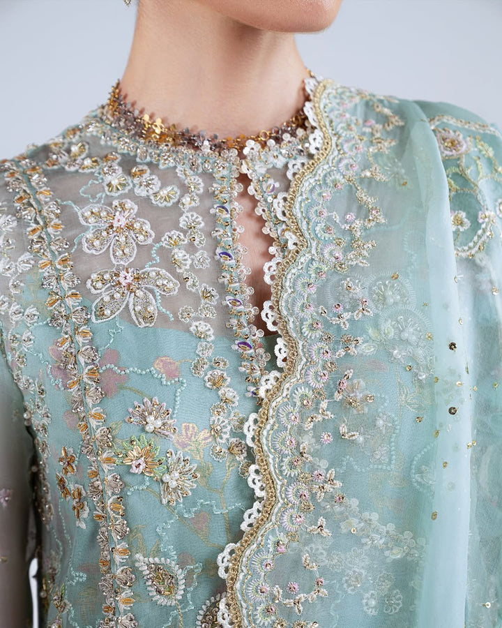 Product Description: In serene aquamarine, this four-piece look exudes refined elegance. The organza paneled angharaka peplum features a keyhole neckline with tassels, lace accents, and sequin edging over a floral print...