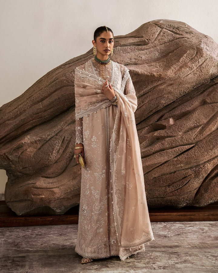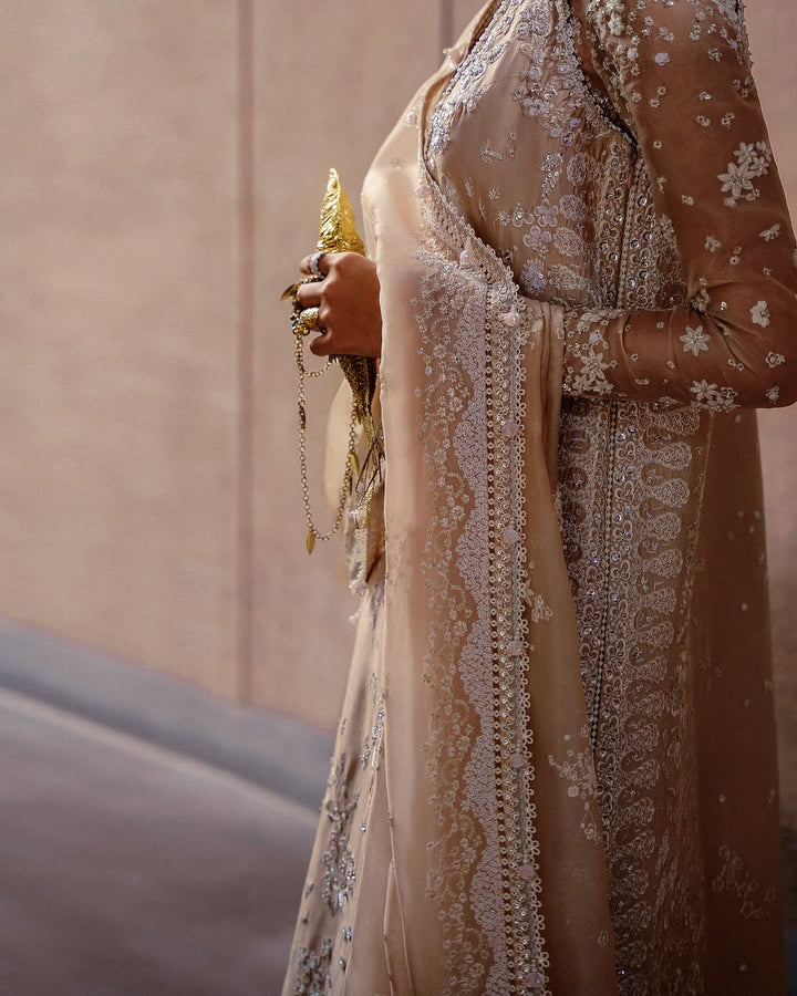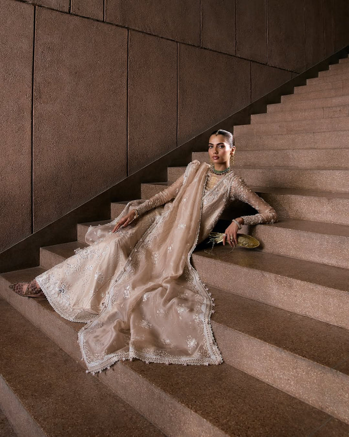 Luxury in nude beige, this four-piece design defines modern elegance. The raw silk front - open shirt features a plunging halter neckline with organza fitted sleeves straight undershirt embroidered with white and silver motifs. Styled with a silk slip , bell-cut silk pants, and an organza dupatta finished with sequins, layered borders, and tassels, the ensemble is sophisticated and refined.