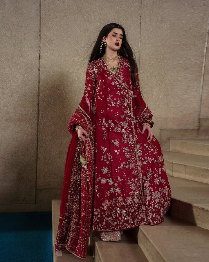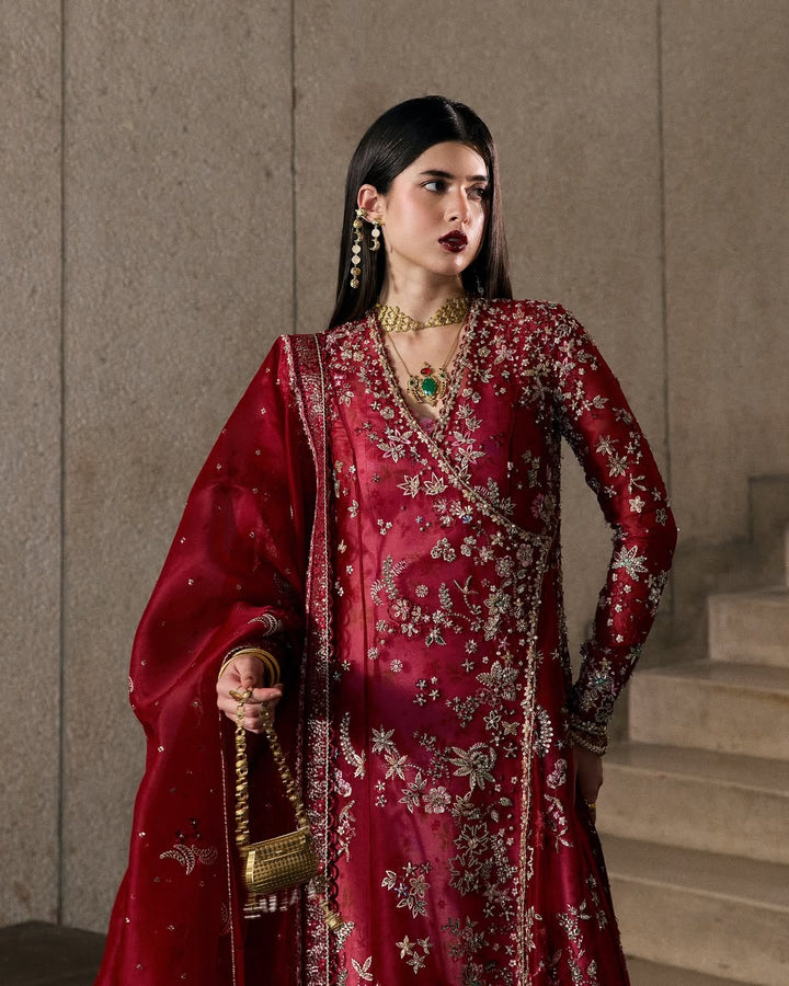 A rich wine-red ensemble featuring an angrakha-style front-open organza shirt with an overlapping V-neckline. Embroidered in pink, green, and gold, the shirt is accented with intricate lace on the hem and sleeves, finished with a front tassel, layered over a printed pink raw silk slip. Soft pink raw silk sharara pants feature scalloped sequin borders for a glamorous touch. The organza dupatta echoes the opulence with four-sided sequin patti and a heavily embroidered pallu adorned with chaand bali motifs and lace finishes.