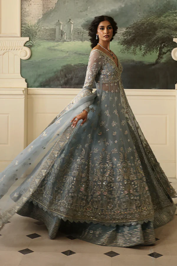 Introducing the Jasmine Pishwas, a graceful ensemble in a serene ice blue shade. This outfit features an organza shirt beautifully embellished with floral embroidery and sequins. Paired with a raw silk...