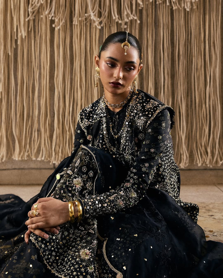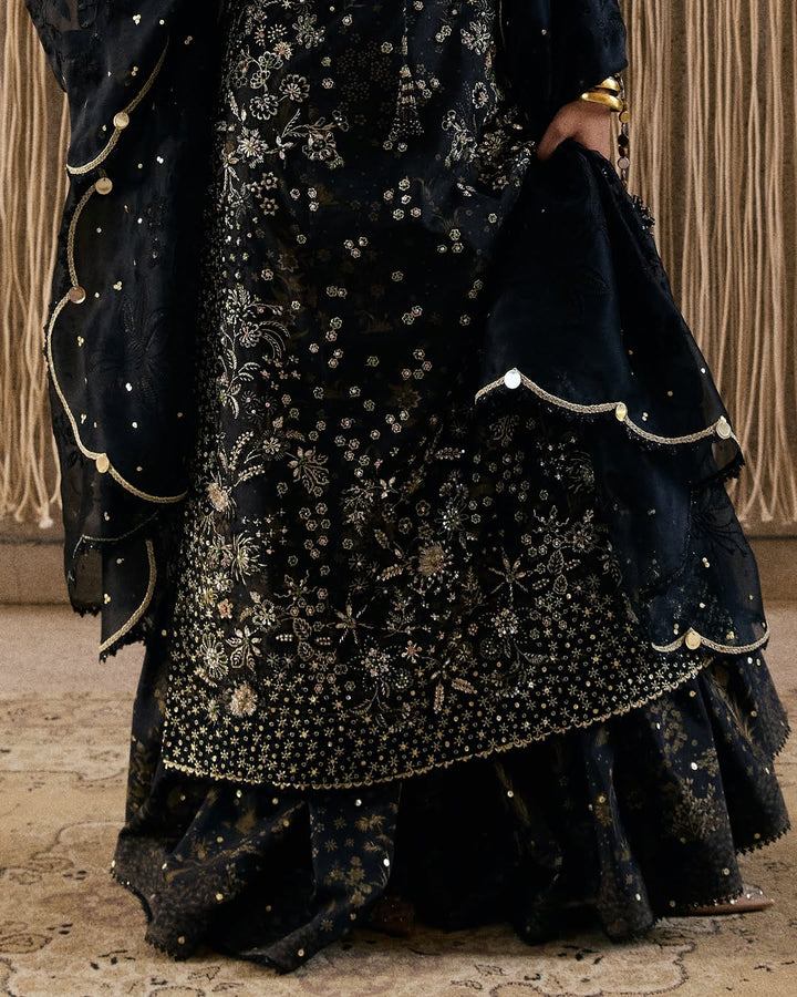 In deep coal black, this three-piece set features a raw silk printed straight shirt with embroidered detailing around the crew neckline and organza patching. Accented with lace extending to fitted sleeves that widen at the shoulders for a capped look, finished with gold tassels. Paired with matching raw silk gharara pants detailed with low lace and gold sequin spray. The organza dupatta completes the look with a scalloped border and gold sequin coin tassels.