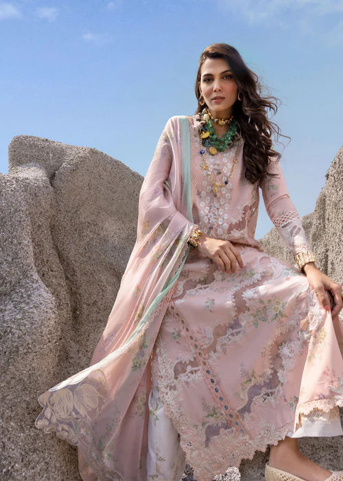 Additional Description: Leyla - The second colorway is a design that evokes a sense of calming elegance. It's luxurious baby pink canvas has an overall geometric patter embroidered in 'chicken' technique. Beautiful botanical florals are sketched all over the chicken pattern whispering tales of sophistication and charm. The Daman is on cotton net meticulously embroidered in a floral jaal with hints of cutwork lace like motifs. The neckline is a delicate lace, floral border on organza in pale pink. Paired with a cotton net dupatta, adorned with a border on all four sides. - Embroidered Lawn Front Center Panel-1 Right Side–1Pc - Embroidered Lawn Front Center Panel-1 Left Side–1Pc - Embroidered Cotton Net Front Center Panel Lower-Right Side & Left Side–1Pair - Embroidered Lawn Front Side Panel Pair-1–0.45Mtr - Embroidered Cotton Net Front Side Panel Lower-Right Side & Left Side–1Pair - Embroidered Lawn Back & Sleeves–1.4Mtr - Embroidered Organza Neckline–1Pair - Embroidered Organza Sleeves Motifs–1Pair - Embroidered Organza Trouser Border–1.15Mtr - Embroidered Cotton Net Dupatta–2.6Mtr - Embroidered Organza Dupatta Pallu Border–2.3Mtr - Solid Dyed Cambric Trouser–2.5Mtr Disclaimer: Please note that the color of the item you receive may vary slightly from that shown in the product shoot. This can happen due to the variation in light at the time of product and fashion shoot. This is a concept stitched article and may not contain certain embellishments.