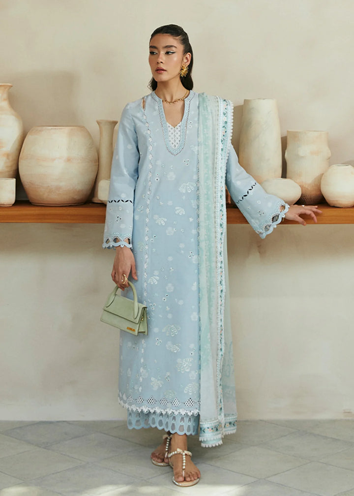 Ice blue color, slight a-line panelled shirt on a base of lawn jacquard. Contrasting white embroidery and chiffon complements. Straight u neckline with keyholes accenting the shoulders. Embroidered sleeves and hem with stitching details. Culotte trousers with...