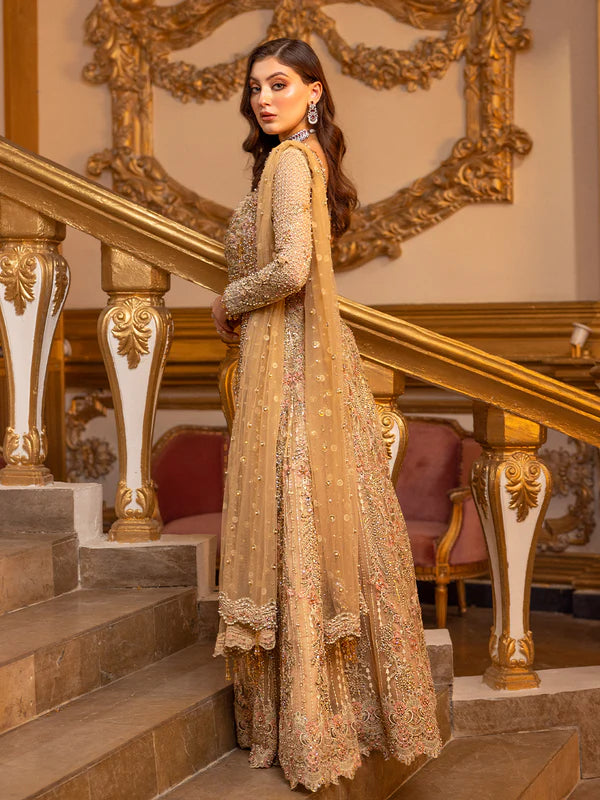 Majestueuse, an unfaltering elegance features a beautifully crafted Lehnga and Choli with embossed raw silk. Majestically rendered Choli is embellished with Pearls, sequins and crystals chains while being layered with flowery motifs. Beautifully Paired with embellished net dupatta, having an artistically illustrated details on boarders all around infusing a contemporary yet subtle vibe.