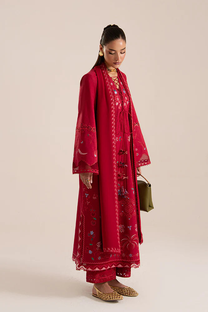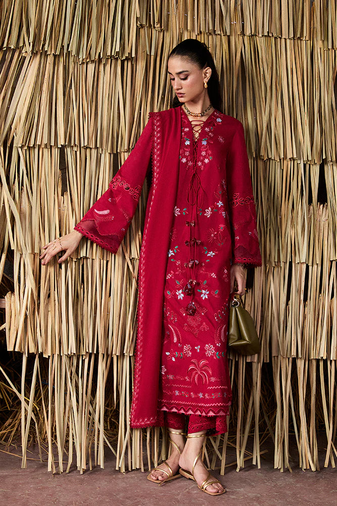 Product Description: Ruby red straight jacquard lawn shirt with V-neckline and hanging threaded tassels. Appliqué-style embroidery in bold contrasting tones with geometric patchwork on hem and corners. Sleeves end in organza...