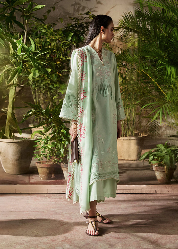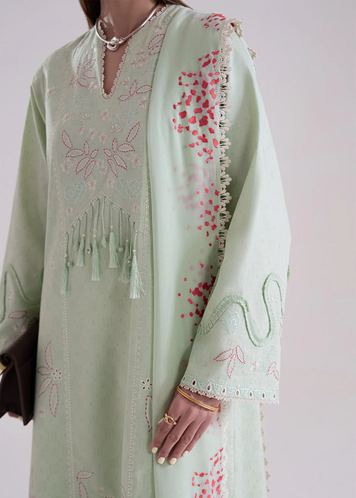 Product Description: Mint Green drop-corner jacquard lawn shirt with a slight V neckline. Features geometric floral embroidery with curtain-like tassels, floral boring on hem, and bell sleeves with winding stitch details...