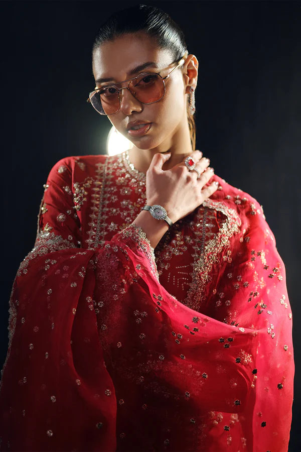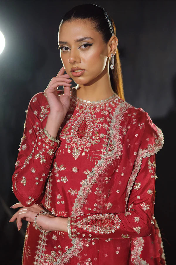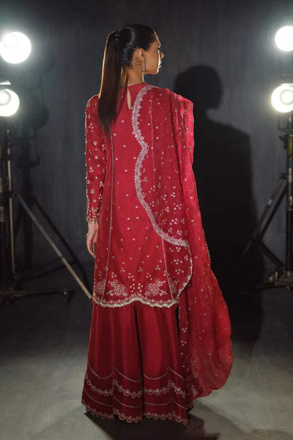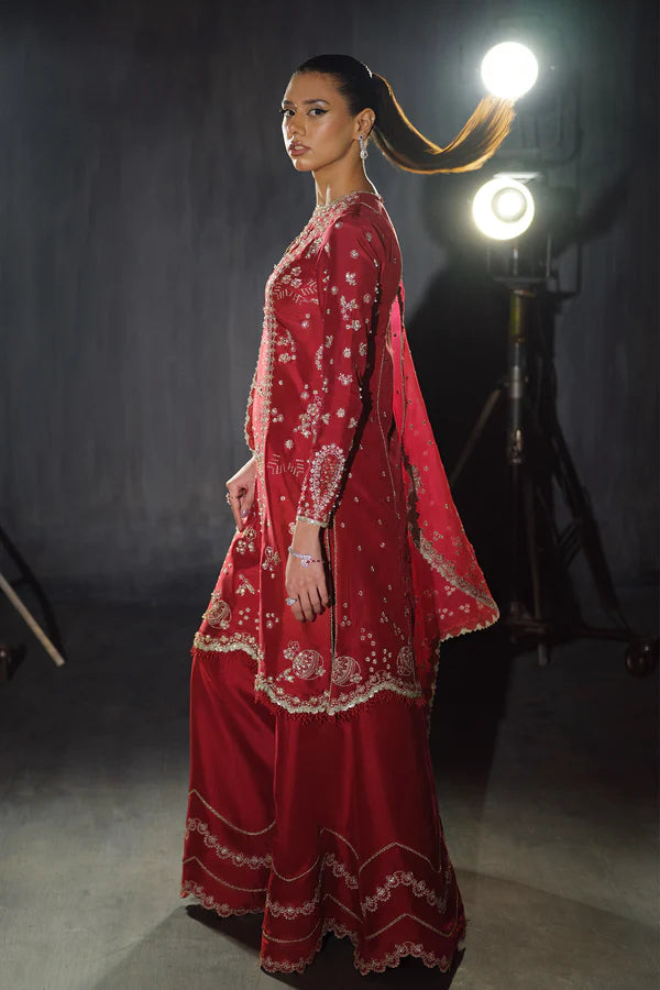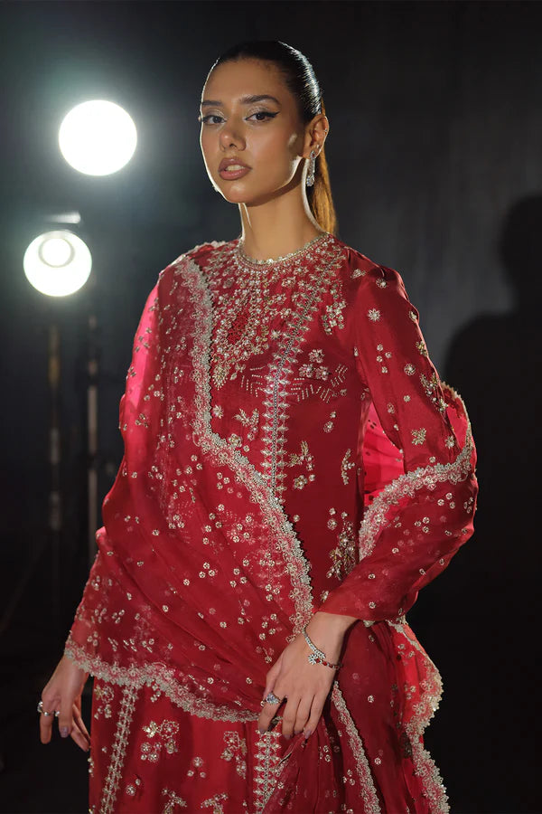 Rosette is a stunning blend of elegance and luxury. Crafted from the finest silk, this dress features intricate floral embroidery with Tilla and Thread, accented by shimmering sequins. Cut Dana embellishments add texture, while lustrous pearls elevate its sophistication. The unique touch of Batki Ana enhances the design, showcasing exceptional craftsmanship. Paired with a silk shirt, silk sharara pants, and an organza dupatta, Rosette is a timeless piece for those who appreciate refined beauty and unparalleled luxury.