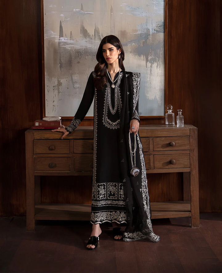 Introducing the stunning ‘Fleurie’, a timeless monochrome creation that blends a deep ebony base with exquisite ivory embroidery. The elegant, streamlined silhouette is embellished with intricate floral and nature-inspired embroidery, all crafted in luxurious silk thread, offering an air of sophisticated grace. Complemented by a delicately embroidered dupatta and perfectly tailored culottes featuring a side slit for a contemporary touch, this ensemble is designed to be a striking statement piece, elevating the beauty and allure of the festive season.