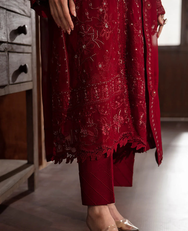Presented in a captivating shade of haute red, this ensemble showcases exquisite embroideries in soft, subtle variations, meticulously crafted with fine threadwork and enhanced with shimmering silver accents. The graceful open-front design, adorned with whimsical floral motifs that gently flow across the chiffon fabric, exudes a refined femininity, elevating the outfit with elegance in every detail. Paired with intricately detailed trousers and a matching scalloped chiffon dupatta, this look radiates an enduring charm that transcends time.