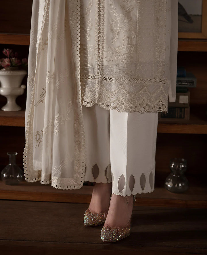 “Fée” Luxuriously rendered in a soft, creamy white, this ensemble is a masterpiece of tone-on-tone embroidery, with delicate thread work that whispers elegance. The scalloped neckline and intricate floral motifs add a refined, feminine grace, elevating the entire silhouette. Paired with a delicate laser-cut straight culottes and an embroidered chiffon dupatta, this ensemble is the epitome of timeless, understated opulence.