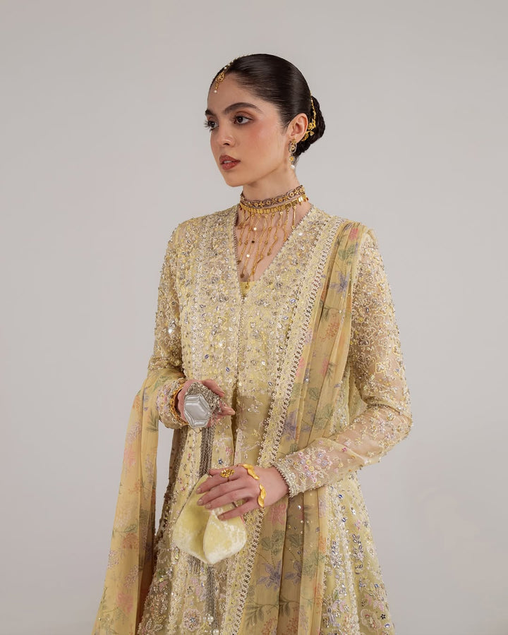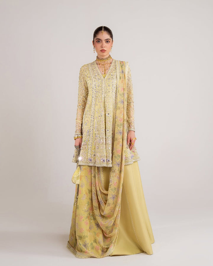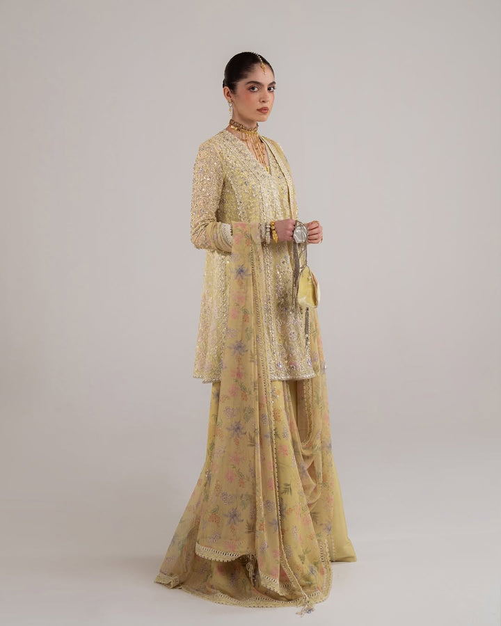 In radiant butter yellow, this four-piece design channels festive elegance. The embroidered organza peplum with a V-neckline and fitted sleeves is highlighted with lilac, rose gold, and mint accents. Paired with raw silk sharara pants styled in a sari-inspired chiffon drape adorned with sequins, prints, and lace, the ensemble is graceful and refined. ( can be ordered as shown with fixed saree drape or with a regular duppatta )