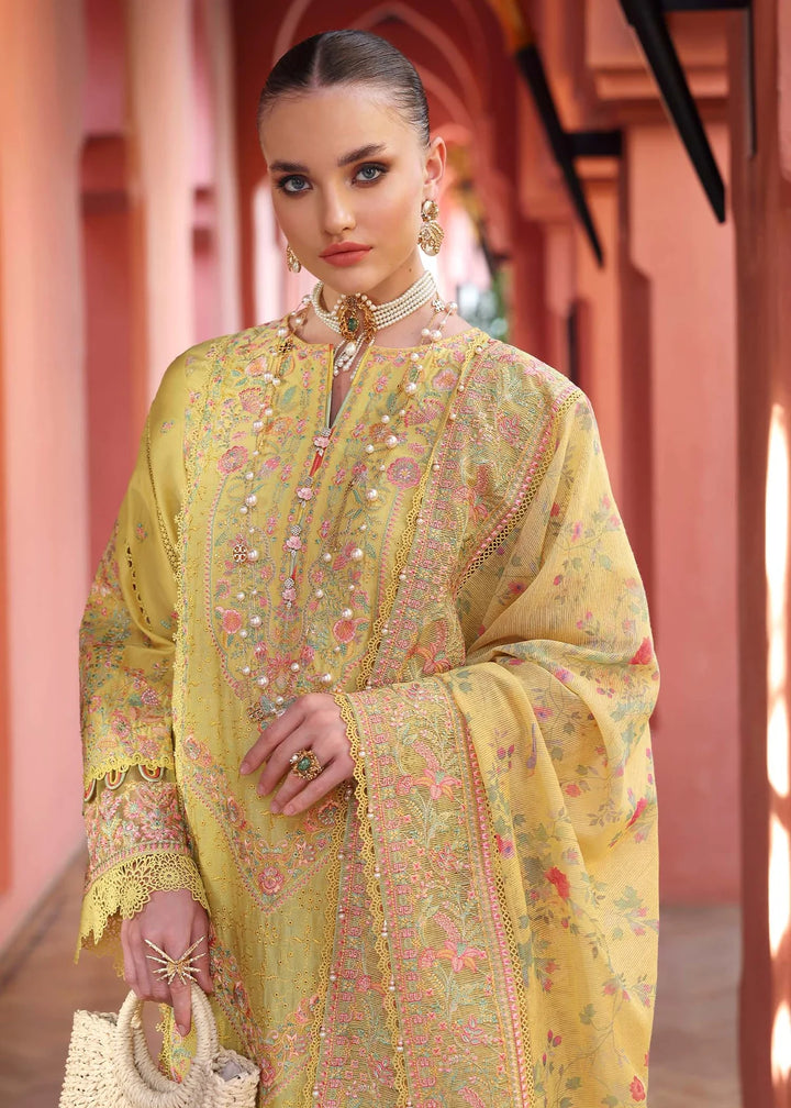 Introducing Summer from Elysia Luxury Lawn collection, A stunning creation that marries timeless craftsmanship with refined elegance. This unstiched ensemble, in a vibrant yellow hue, is a true masterpiece, featuring intricate hand-embellished embroidery that adds depth and sophistication to the rich lawn fabric. The four-sided embroidered border of the dupatta is meticulously crafted, offering an opulent touch, while the subtle printed design from the midpoint provides a graceful contrast to the solid yellow shirt. The dobby textured fabric for the trousers brings a contemporary twist, its refined texture perfectly complementing the ensemble’s traditional elements. Summer is a celebration of artistry and luxury, offering a versatile canvas for personalization while ensuring a look of enduring grace and beauty.
